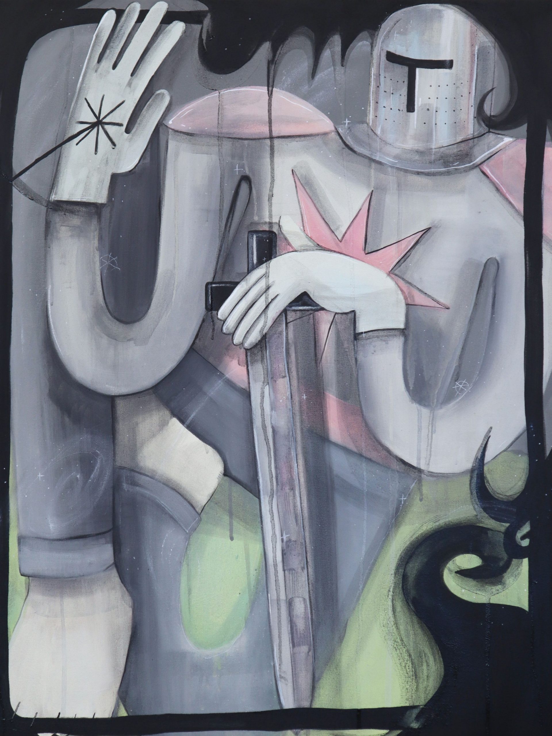 Vojtěch graduated from the Painting Studio at the Faculty of Fine Arts of the Brno University of Technology. His paintings and objects are based on scenes from video games. On canvas, he processes fragments of user interfaces, monsters and snippets of stories. Vojtěch transforms seemingly ordinary functional elements such as icons and cursors into unique aesthetic objects. He often incorporates other materials into his paintings, including metal and textiles.