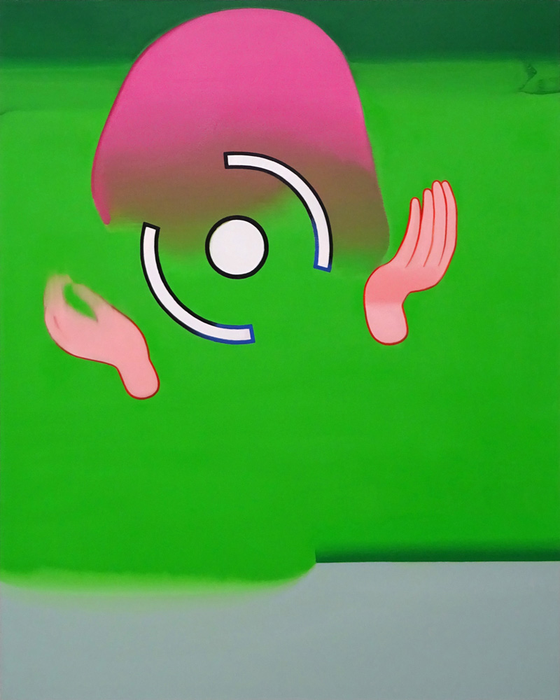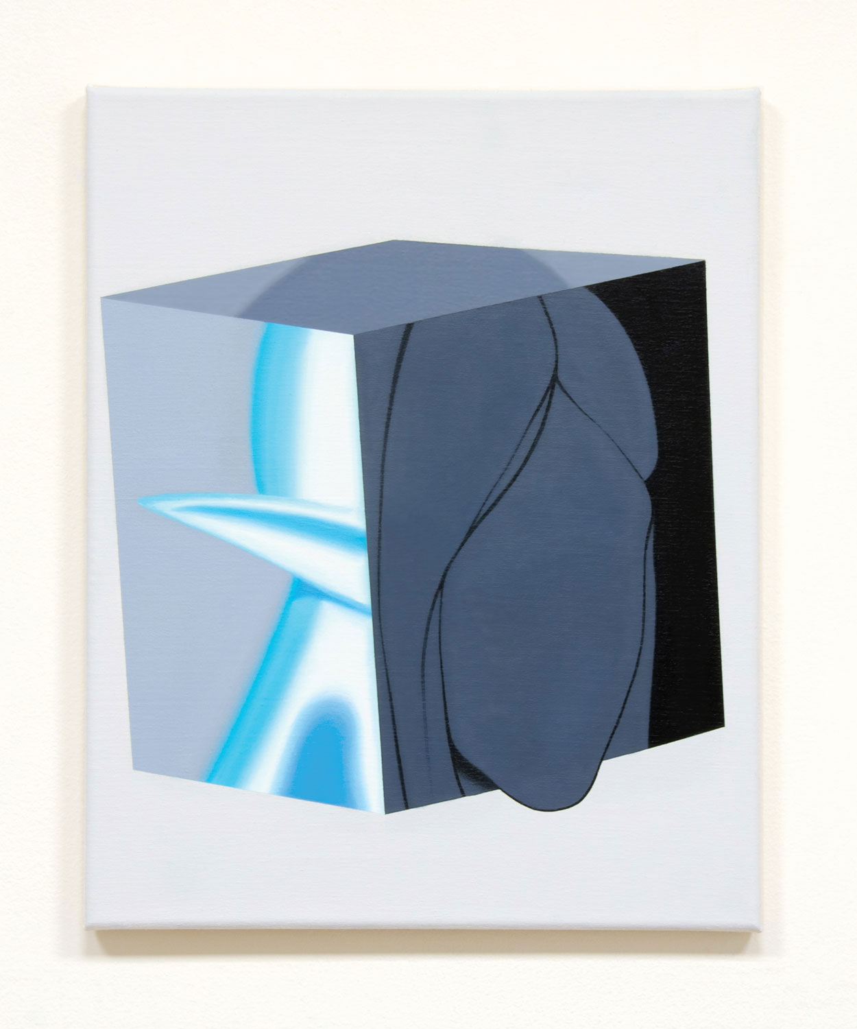 The question of perspective is also an essential part of Alexandra Surovková’s paintings. The Cartesian perspective gives way to a collage-like, flat layering with a delicate airbrush line; the surreal impression, bordering on the decorative and emotional, is bent by the striking teeth of a pixel art hand, the sharp edges of objects as if cut out from graphic software. The promise of transcendence (just look at the names, holy hands and altar) has long been associated with digital technologies – from the beginnings of Silicon Valley in Californian subculture to the word avatar, which in Sanskrit refers to the physical form of a god. The raw images are captivating and disorienting, as is the black mirror environment of the monitor, which conjures up an illusion of depth on the desktop.
