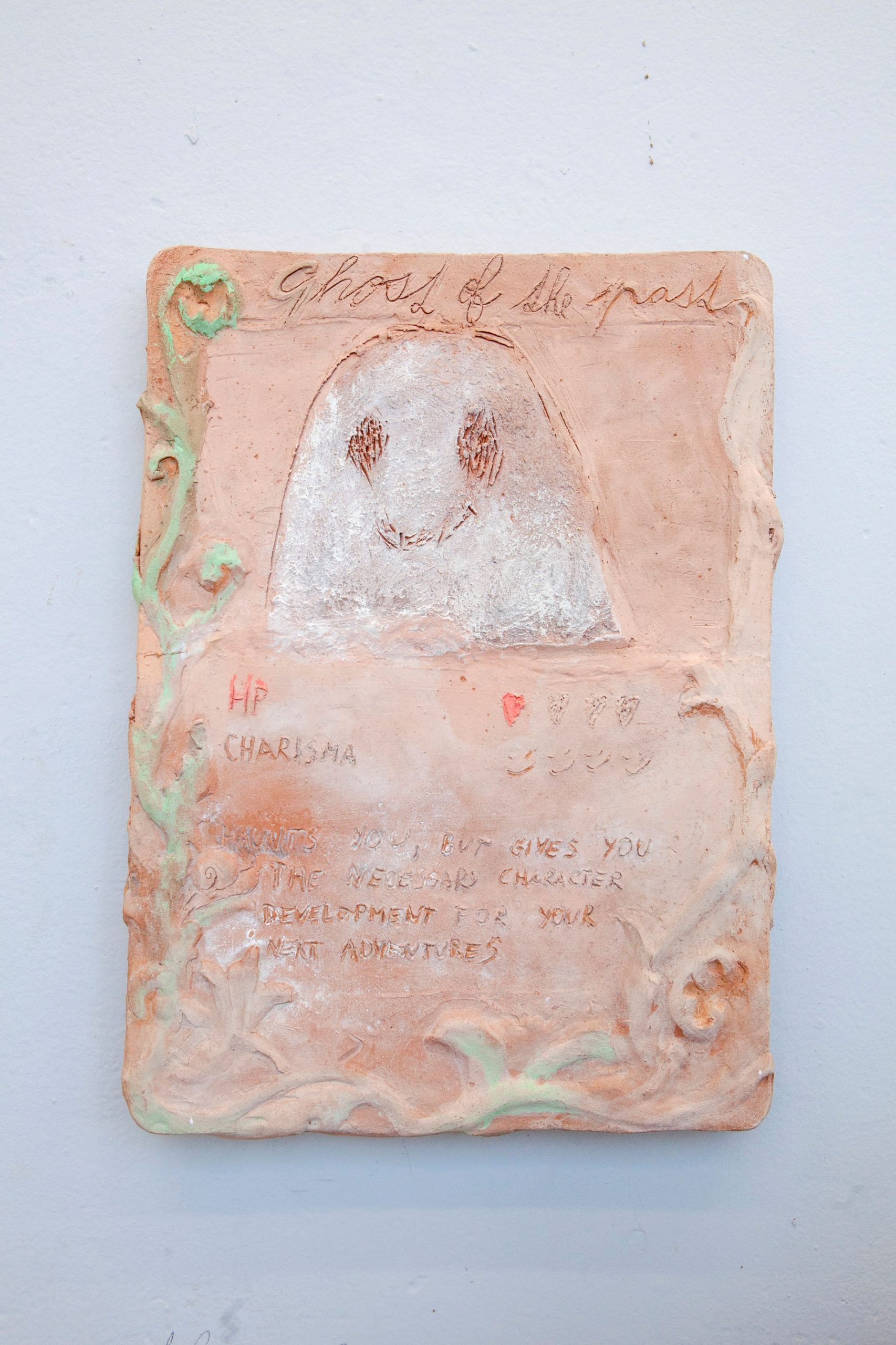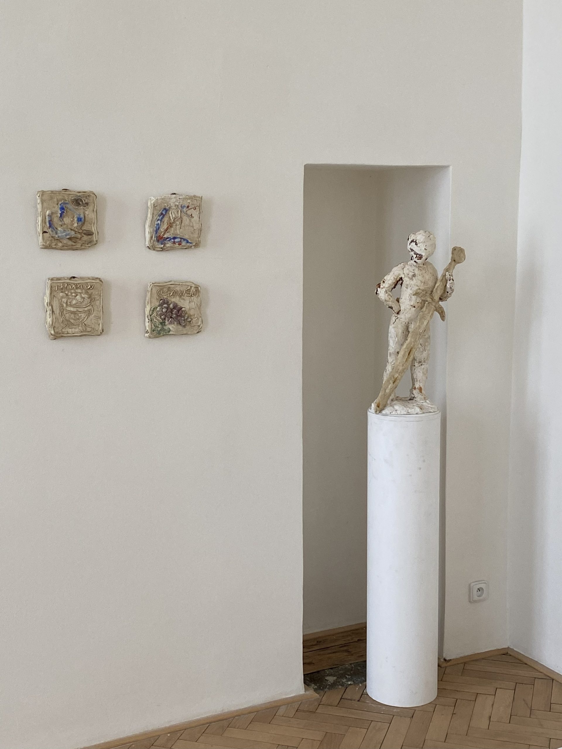 (Micro)transcendence can also be felt in the works of Matyáš Fiala. Blind demi-god, with his disproportionately large sword, evokes associations not only with gloomy Gothic games such as Elden Ring, but also guards a quartet of objects reminiscent of icons from an action RPG or decorations from some kind of shapeless temple. The weight of the material from which the loose ceramic blocks are made brings with it a monumentality (or perhaps an aura) that is characteristic of this trend in contemporary art. Fiala being more than just superficially captivated by fantastic motifs is evidenced by Ghost of the Past on the adjacent wall. The language of video games becomes a means of talking about difficult emotions. The self-ironic text and the smile of the cute creature indirectly refer to an illustrative style reminiscent of, for example, the charmingly disturbing adventure game Omori.