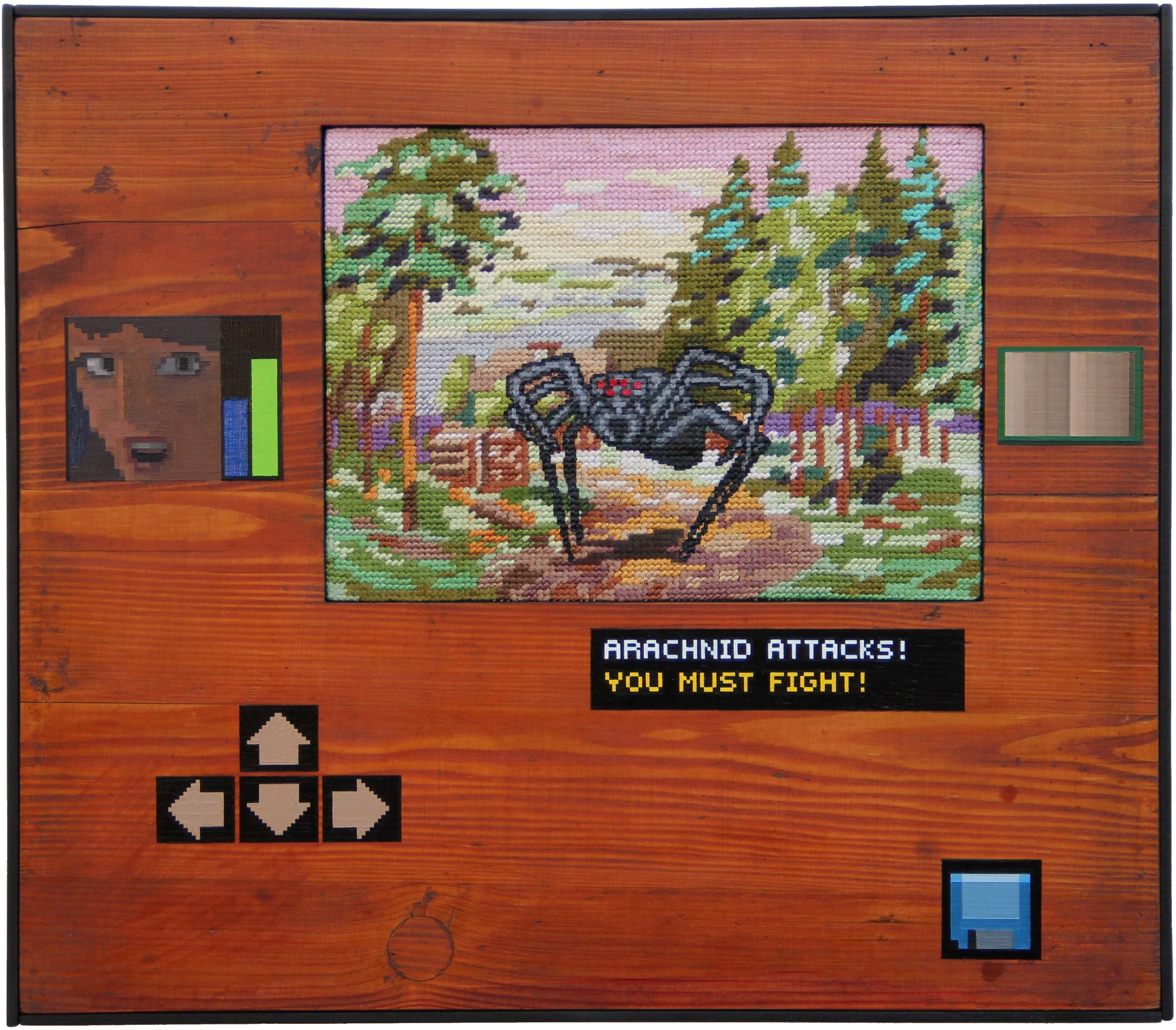 A pair of paintings by Vojtěch Luksch then works with the nostalgia evoked by the graphics of a now obsolete generation of game consoles. The metal base and inscription from the survival horror game Silent Hill or the battle with a spider from a role-playing game create an ambiguous tension – on the one hand, these are objects that seem almost soothing because they use an aesthetic vocabulary that we associate with a carefree childhood. On the other hand, they implicitly criticise the essence of such a retro-loving gesture by combining handmade techniques (textiles) with pixel art visuals. Was the past so pleasantly pixelated, or is it just an illusion of the flow of media time?